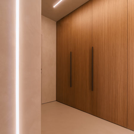 Fra questi, spiccano il legno impiallacciato, finiture in noce canaletto contrastate da intarsi laccati neri, e, ancora, elementi in alluminio e vetro, sui medesimi toni del nero. Le porte, nascoste nelle armadiature, attraverso l’effetto scomparsa, rafforzano l’idea di totale pulizia e rigore geometrico che contraddistingue l’intervento, amplificandone al contempo gli accenti di razionalità e funzionalità, con l’intenzione di creare un’atmosfera elegante e pragmatica.