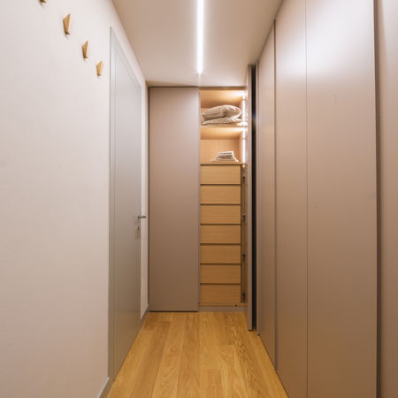Il fil rouge tra colore, materia e luce definisce in modo decisivo e consapevole il design di “Casa Nidi", attraverso una ristrutturazione conservativa che lascia spazio anche ad alcune innovazioni contemporanee. La ridistribuzione degli spazi interni è stata affiancata ad un accurato studio illuminotecnico, che ha portato alla valorizzazione di alcune preesistenze di pregio: come il soffitto del living con volte a crociera e i portali in corrispondenza della cucina e degli spazi serventi. A livello materico, la nuova scala interna, rivestita in rovere naturale, segnala il passaggio dalla zona giorno in pietra naturale alla zona notte, realizzata interamente in parquet. Il ritmo generato dall’ alternanza delle porte di accesso alle varie stanze con i led a raso muro posti in parete, ha reso possibile la trasformazione di un mero spazio di passaggio, come il corridoio al piano primo, in un ambiente scenografico e visivamente accattivante. Il risultato è un cascinale al passo con i tempi, fondato sul legame tra storia, design e contemporaneità.